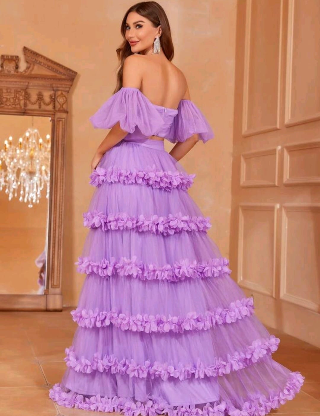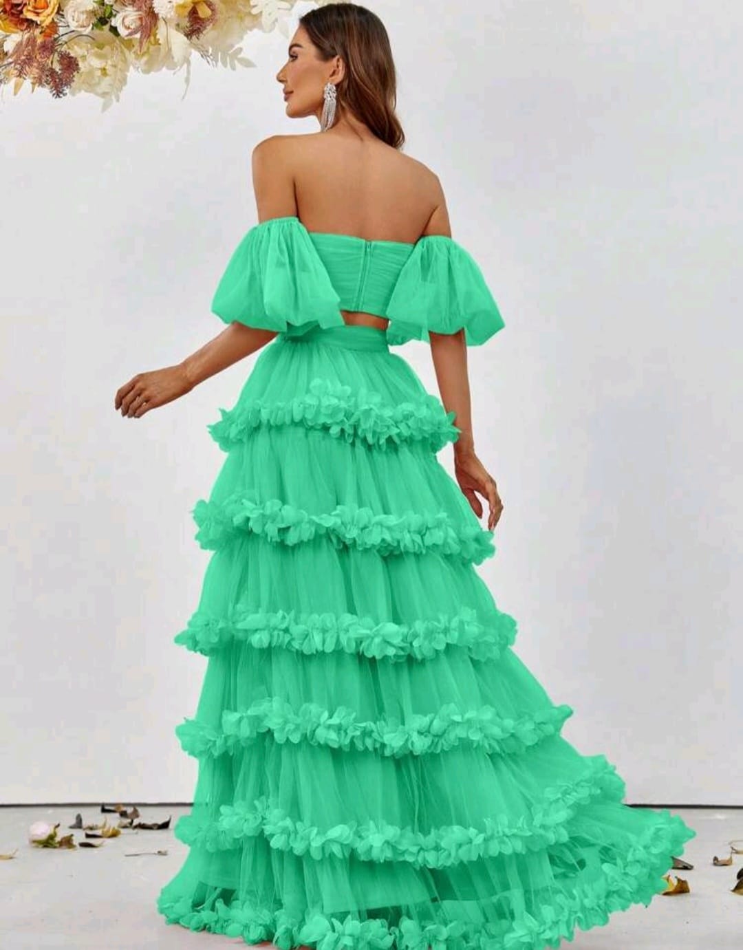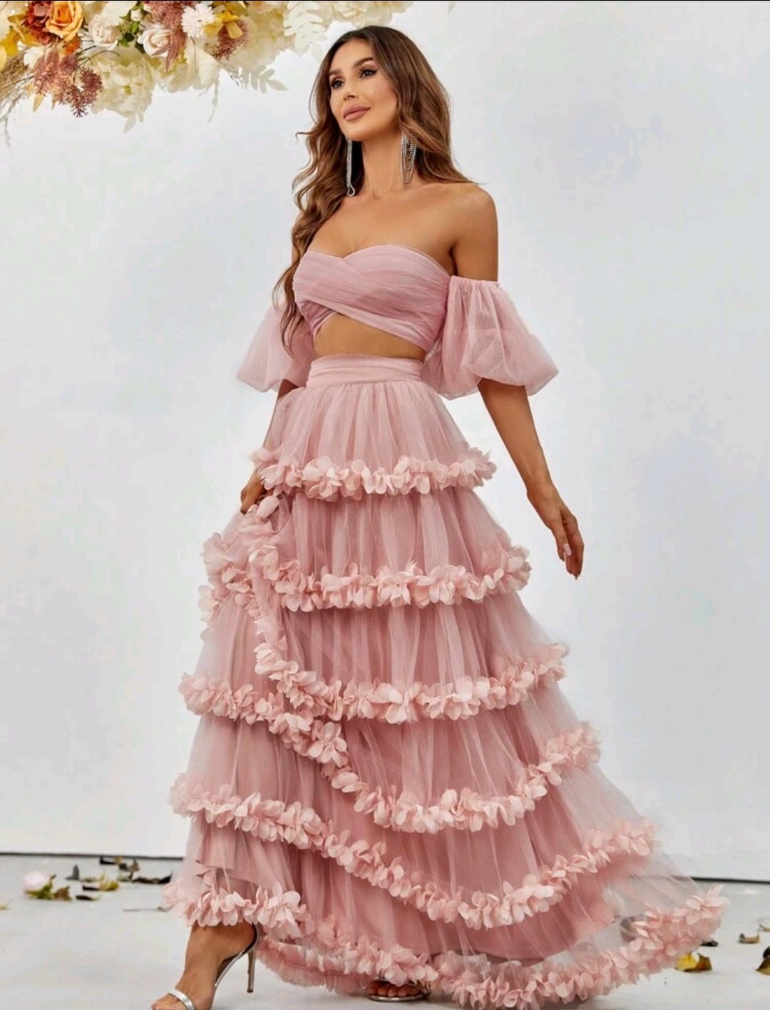 Off shoulder puff sleeve cop top and frill trim skirt