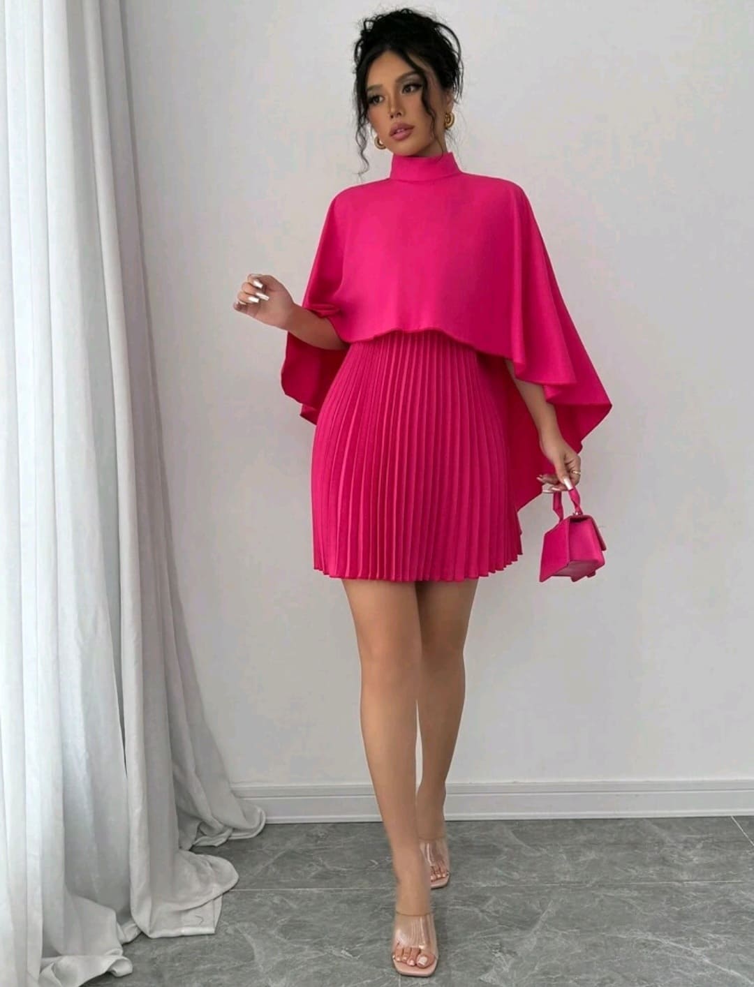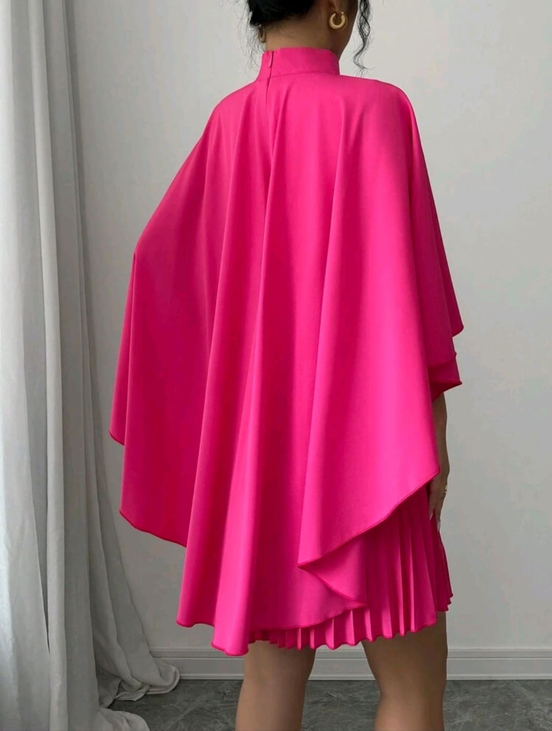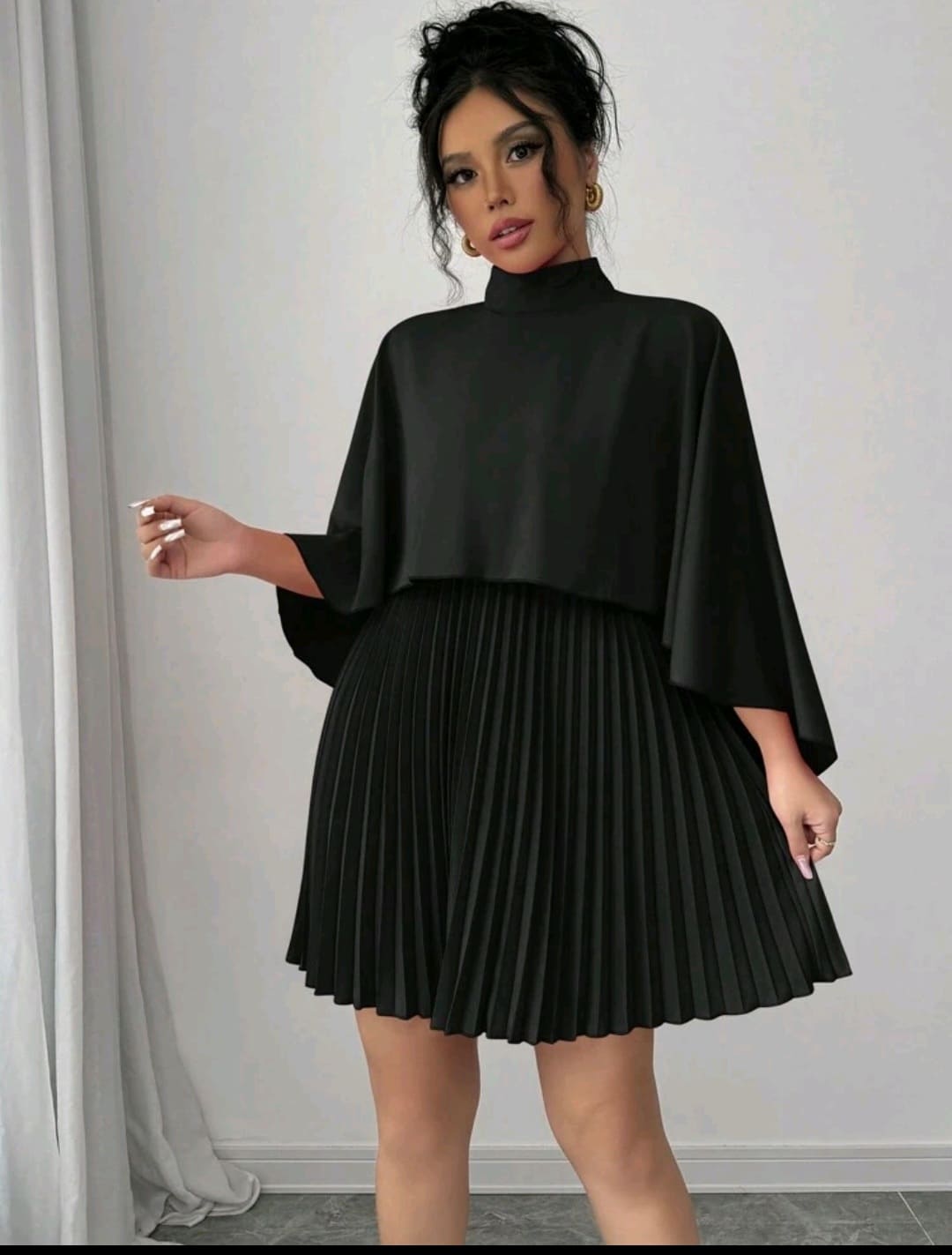 Cloak pleated mock round neck dress