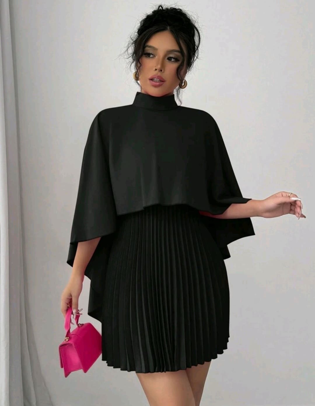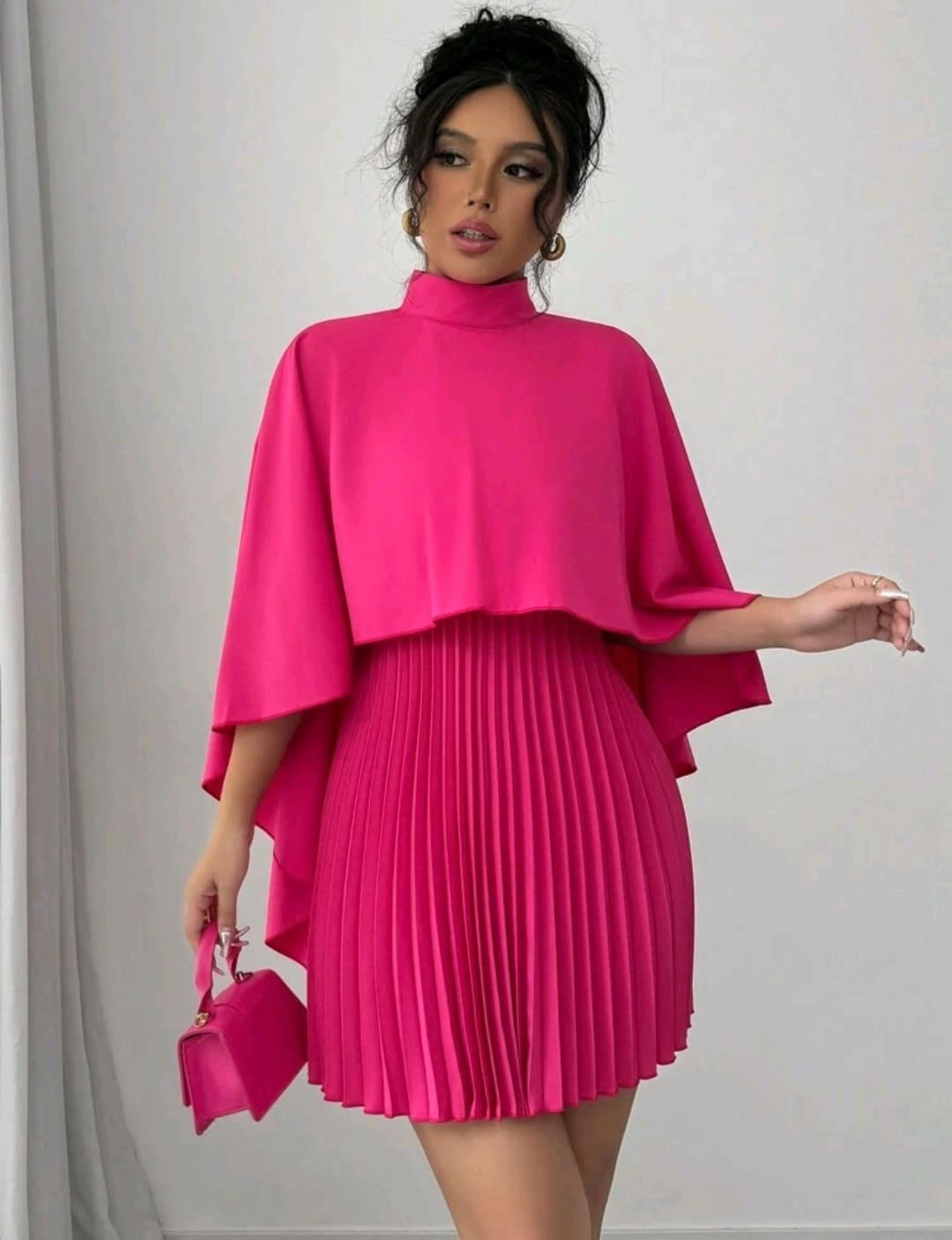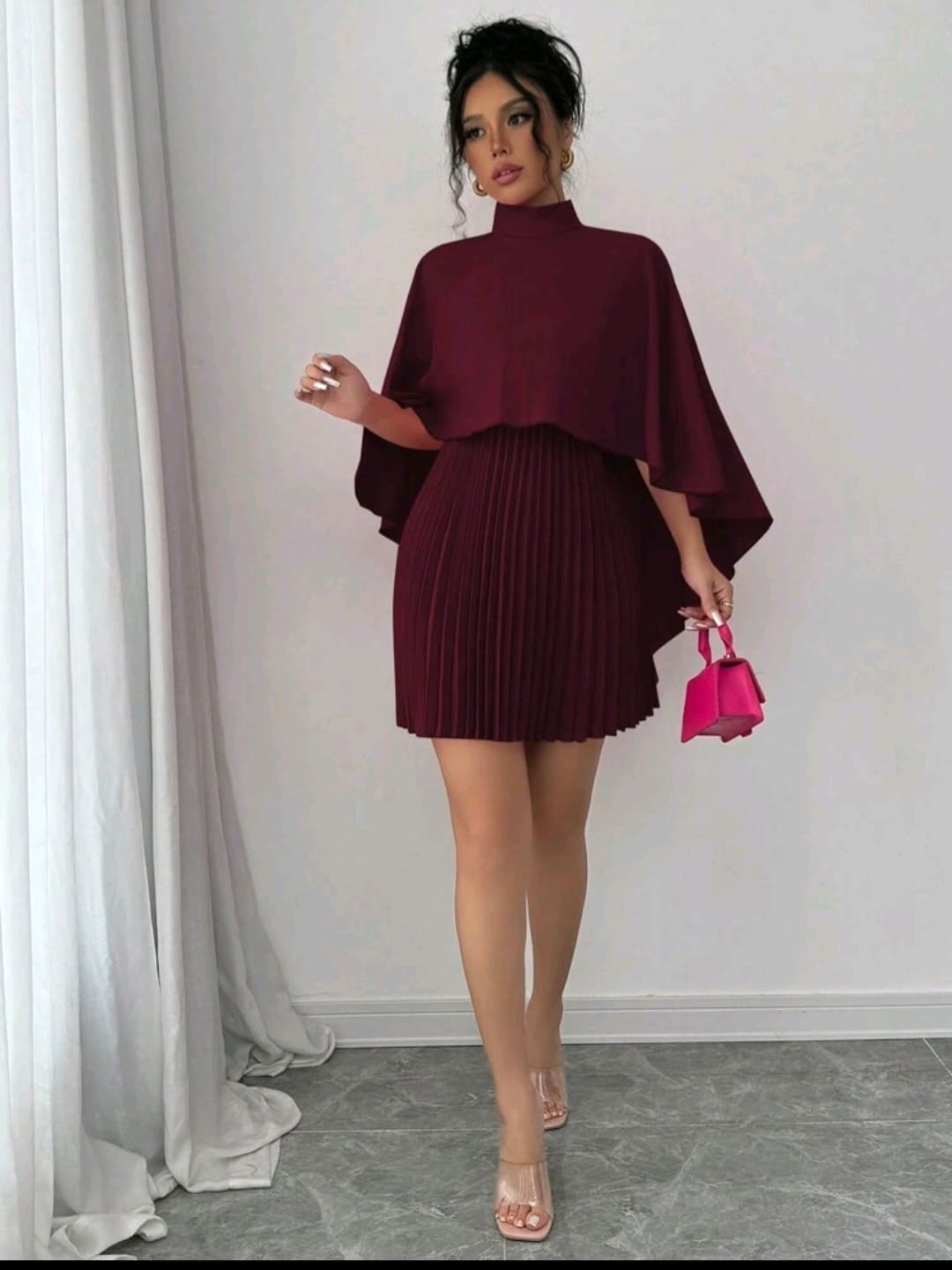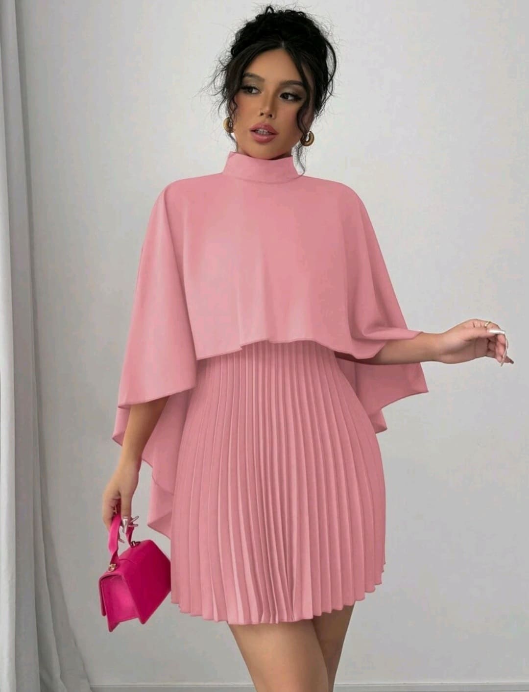 Cloak pleated mock round neck dress