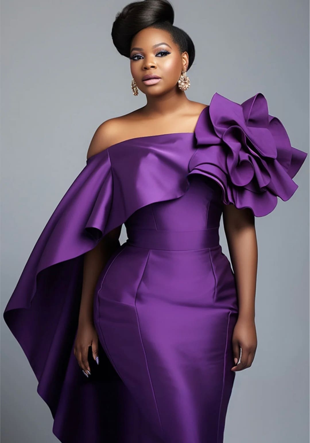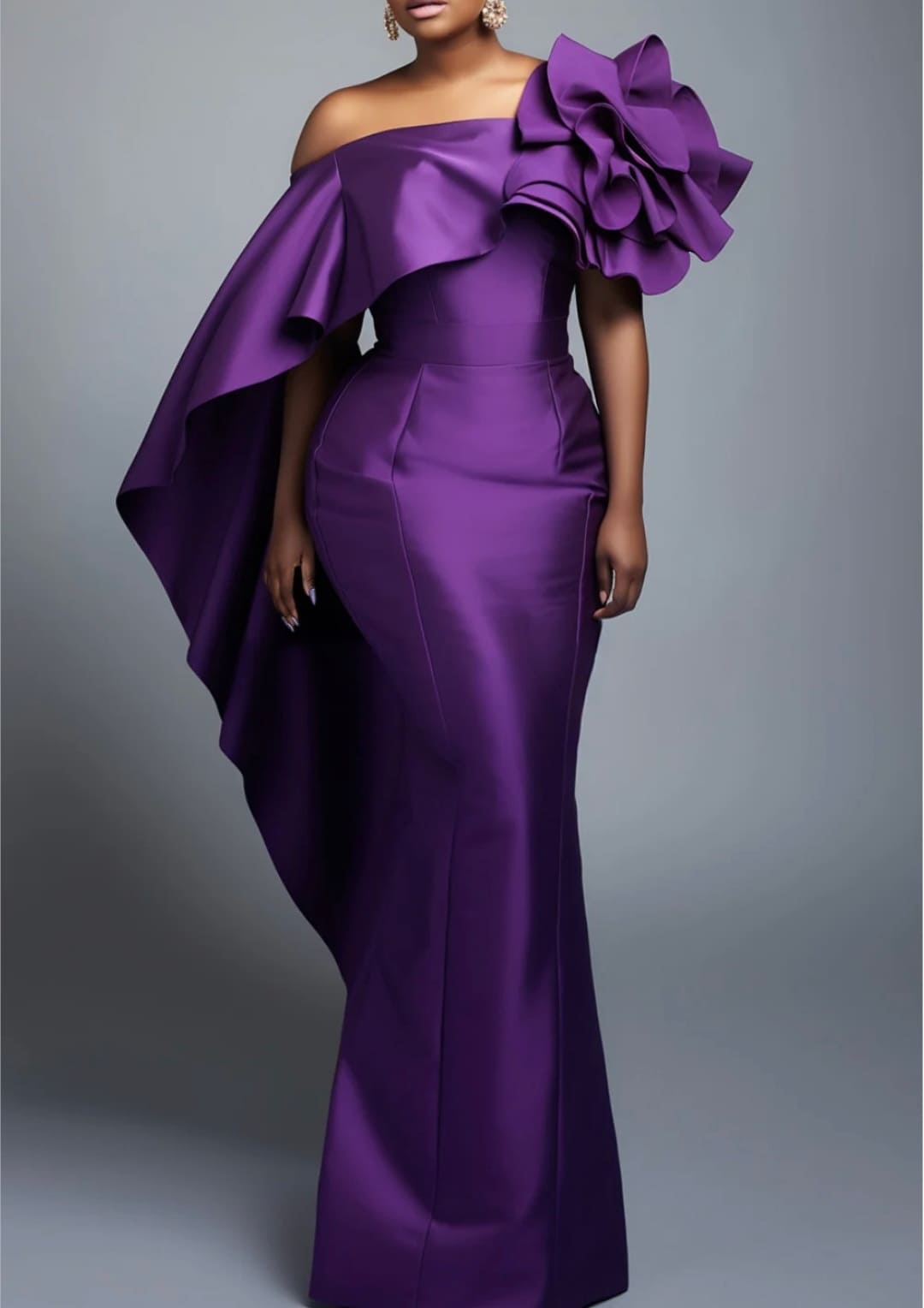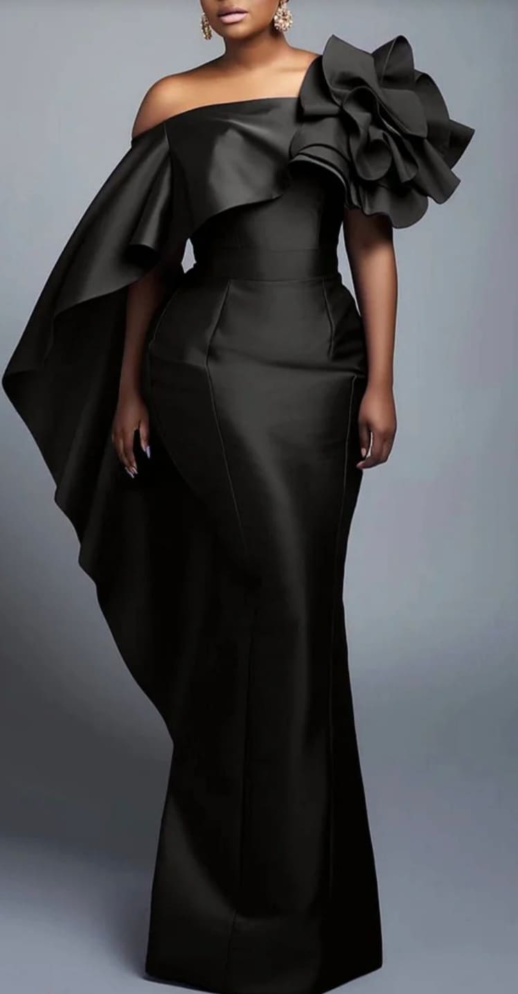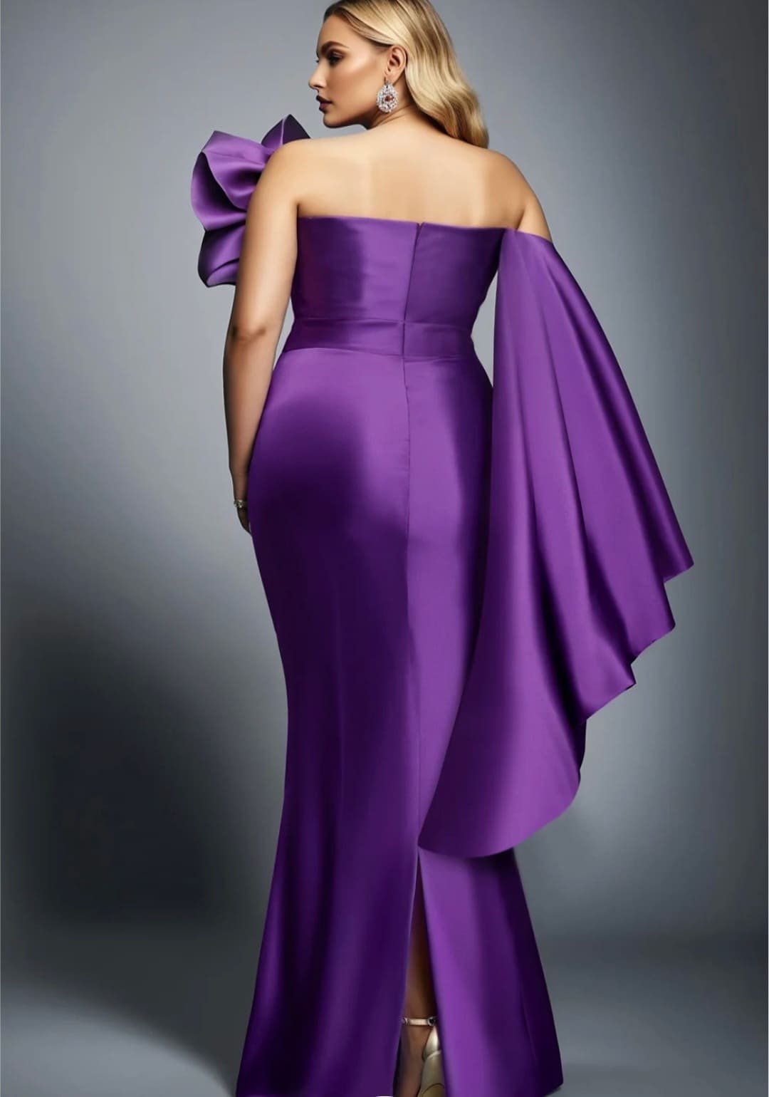 One shoulder long sleeve evening satin gown