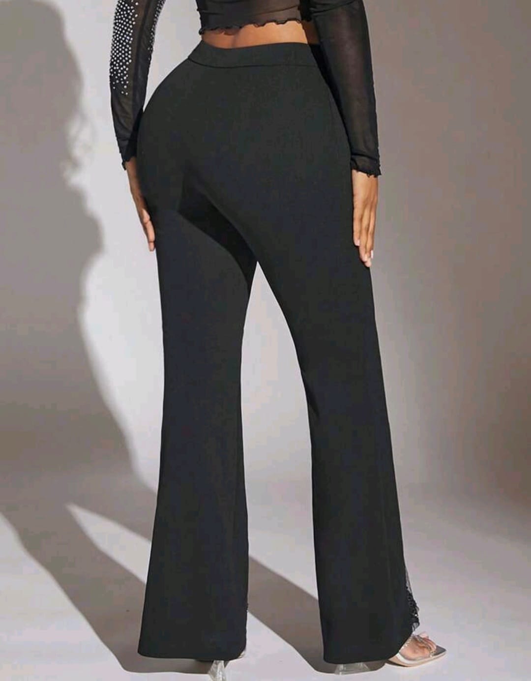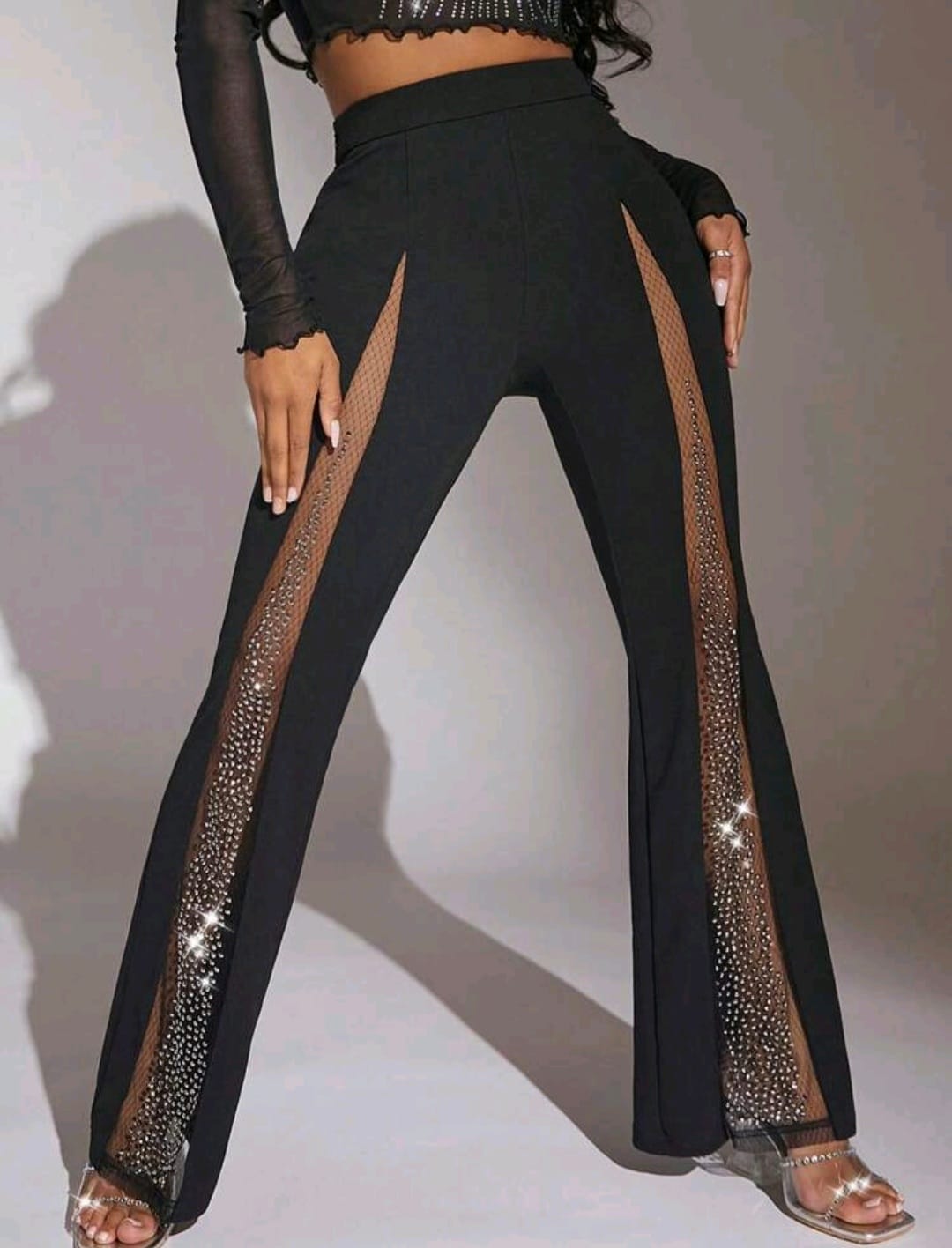 Contrast mesh Rhinestones detailed flare leg pant