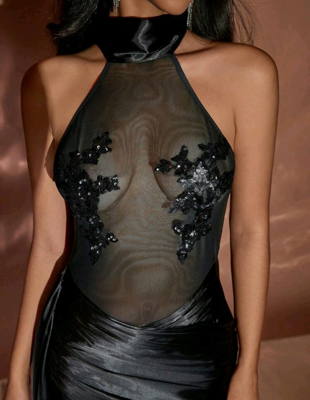 Sequin detail contrast mesh draped side halter neck bodycon party dress
