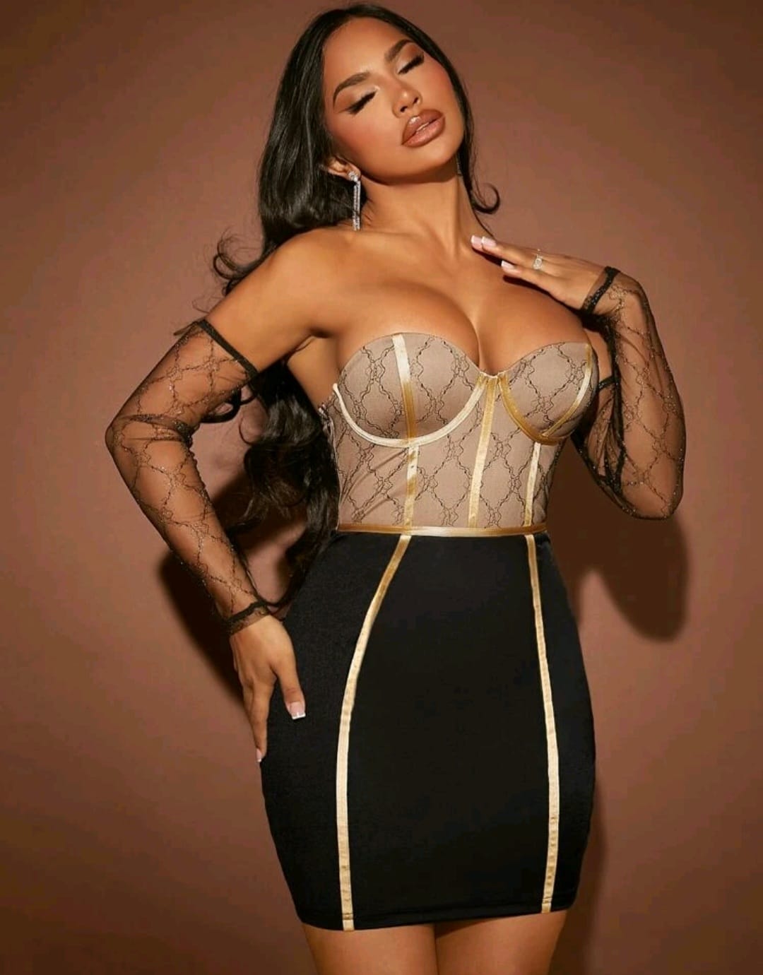 Off shoulder contrast mesh seam bodycon dress