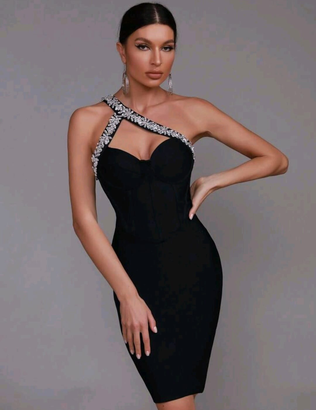 One shoulder rhinestones detail bandage dress
