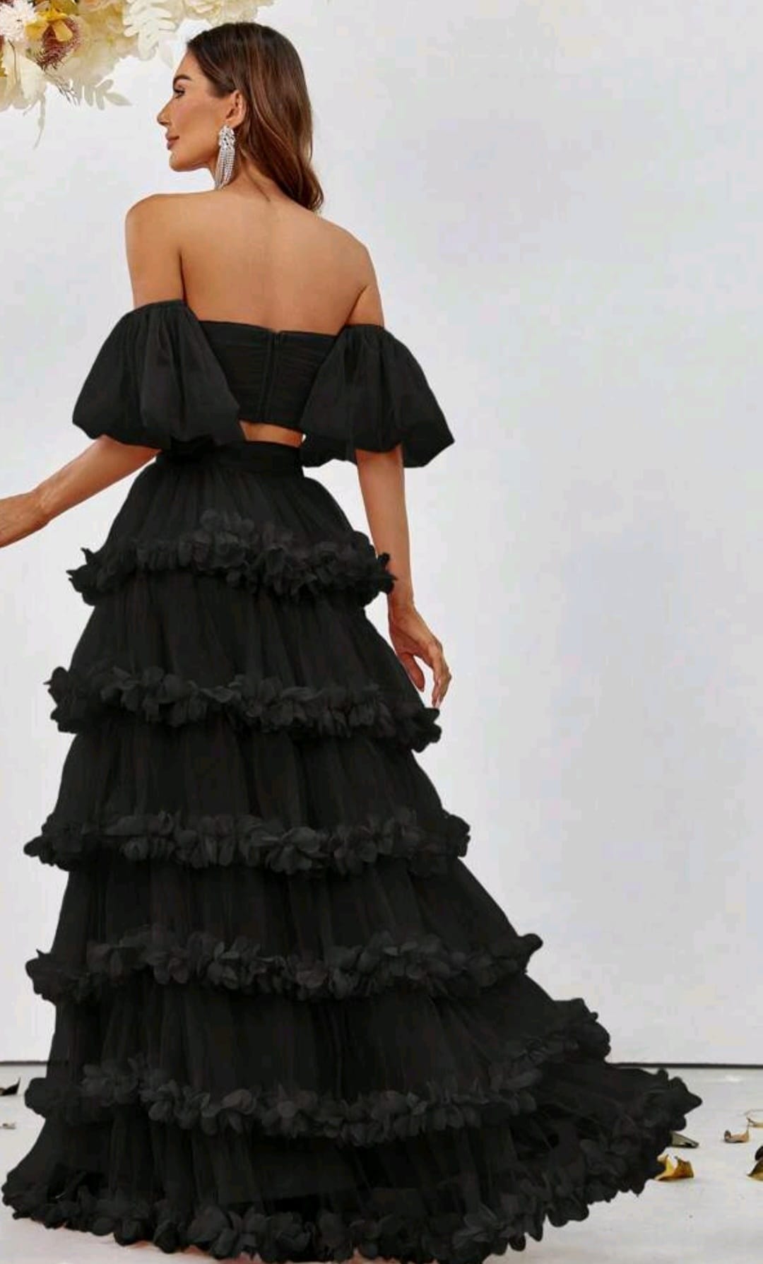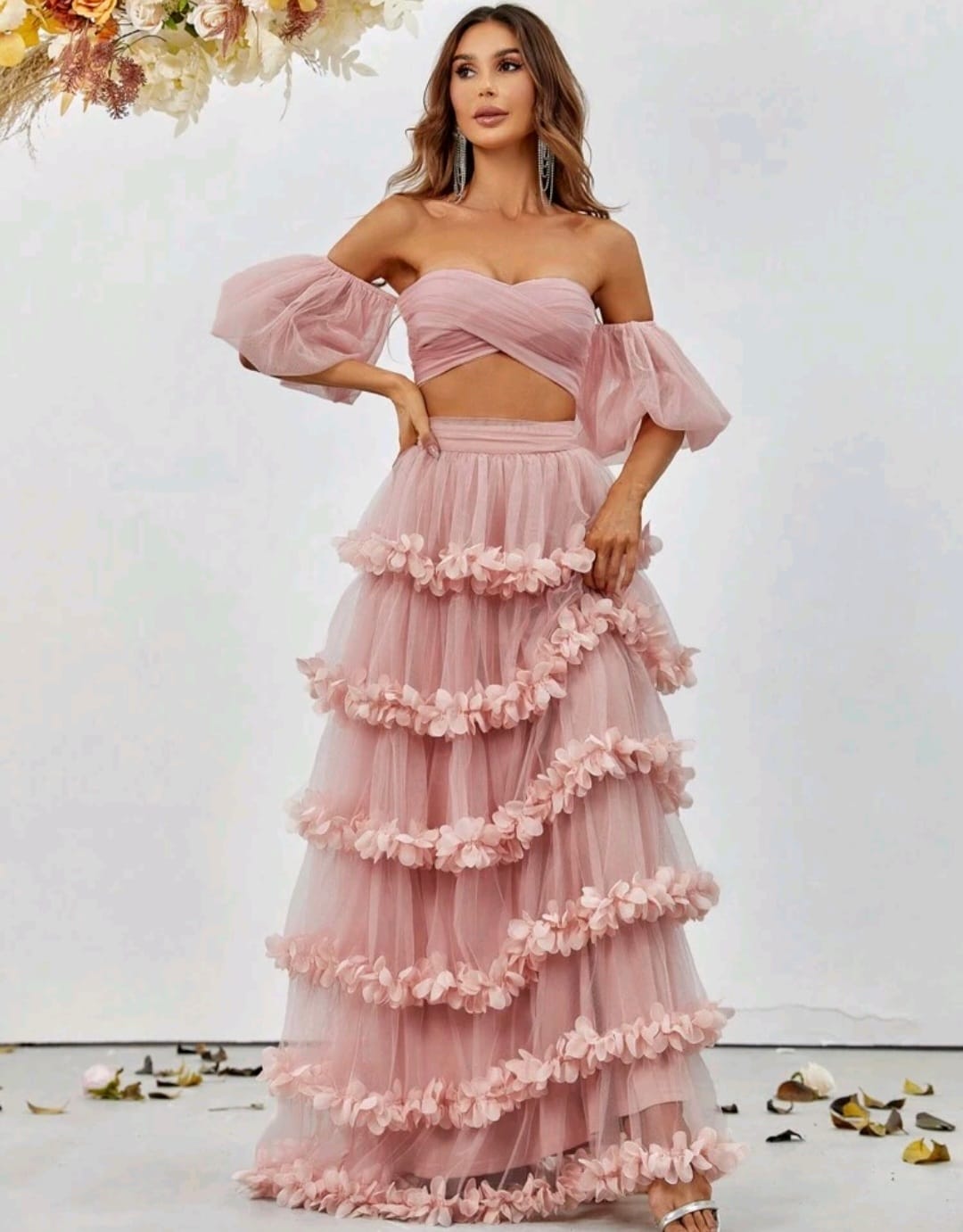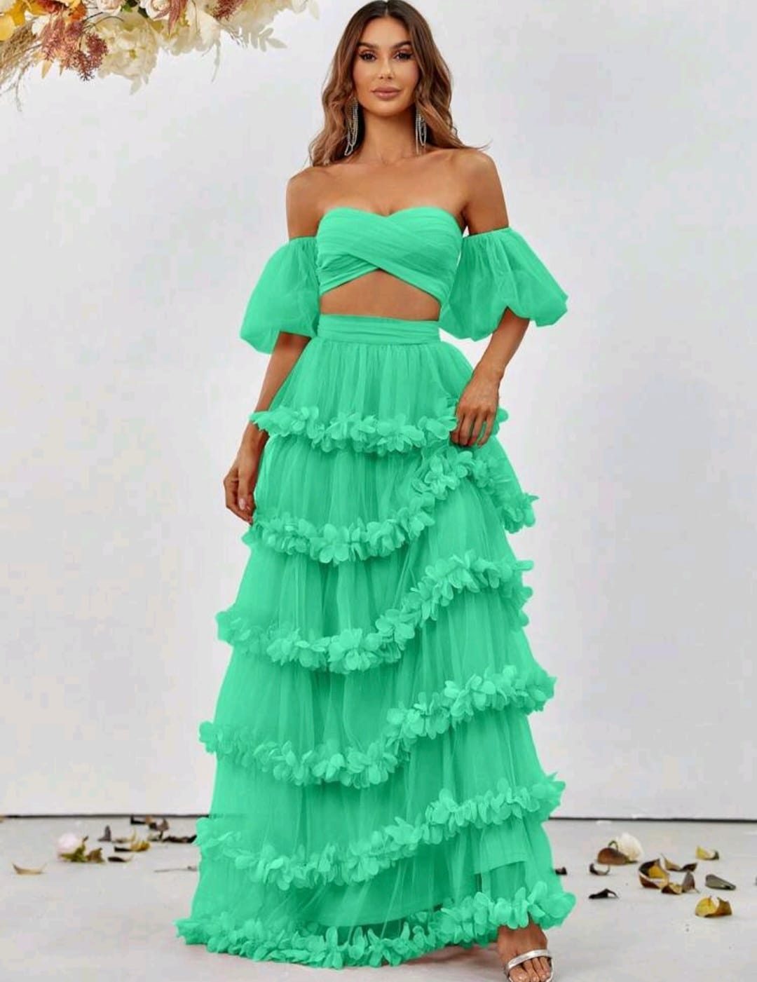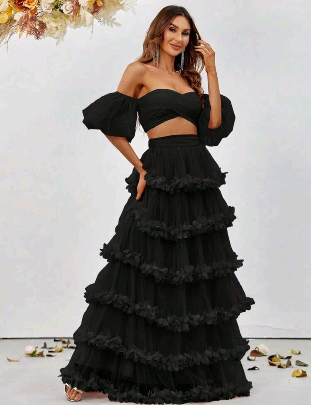 Off shoulder puff sleeve cop top and frill trim skirt