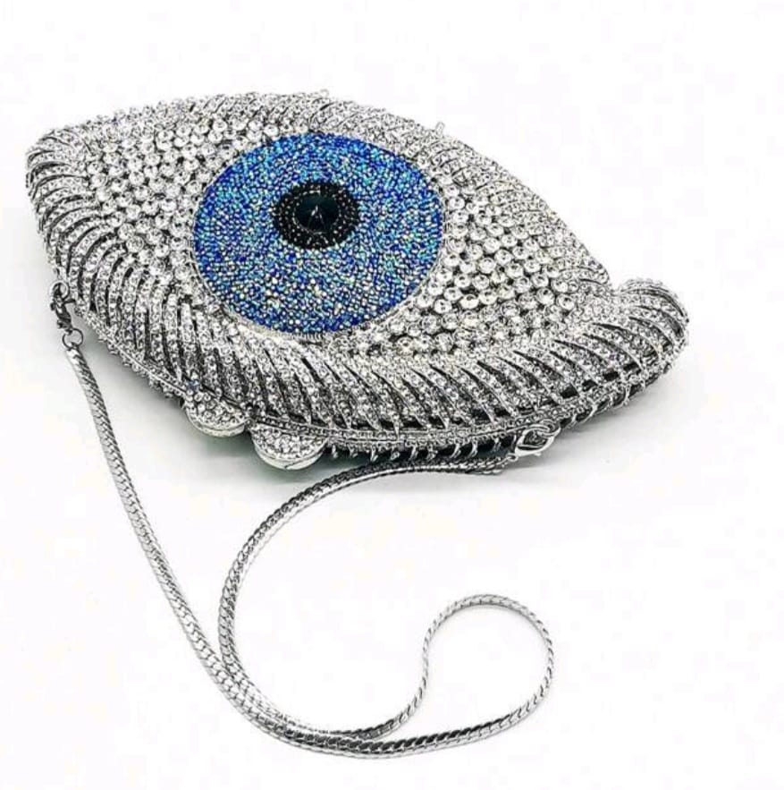 Luxurious evil eye design, rhinestones clutch bag silver and blue crystal evil eye clutch.