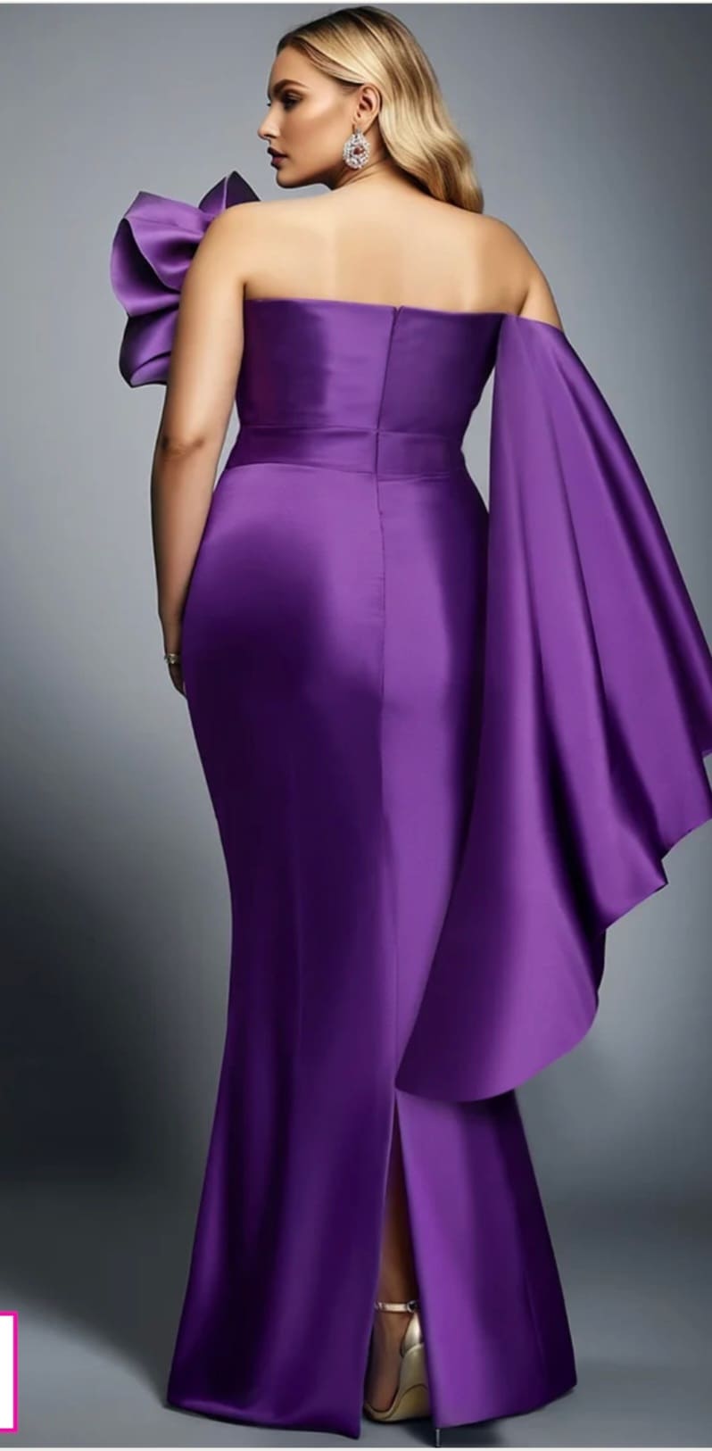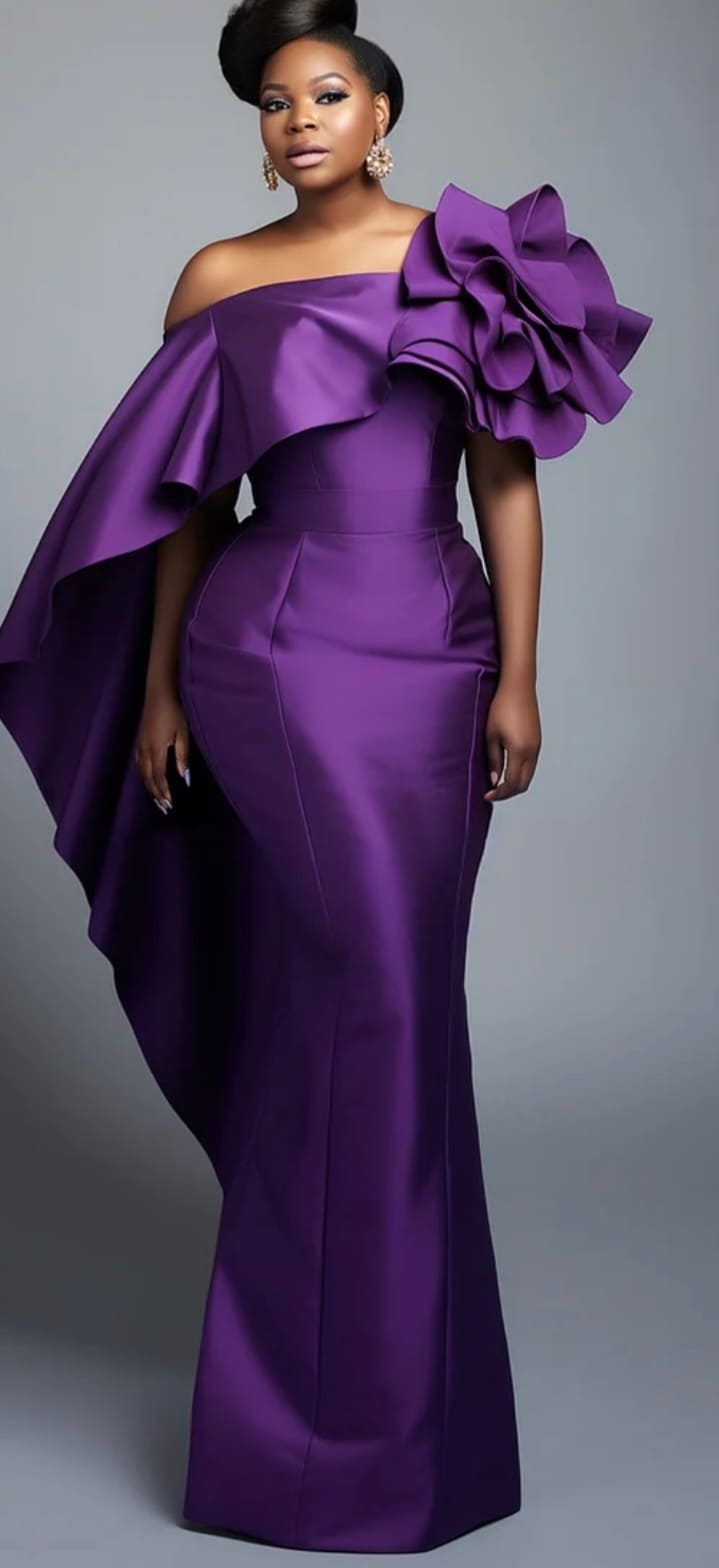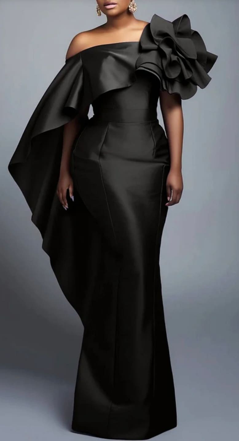 One shoulder long sleeve evening satin gown